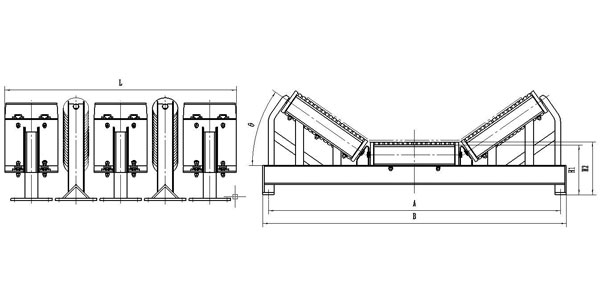 | 型號 | 適用 帶寬 | H1 | H2 | L | A | B | θ | 托輥直徑 | 緩沖條數(shù) | 托輥組數(shù) |